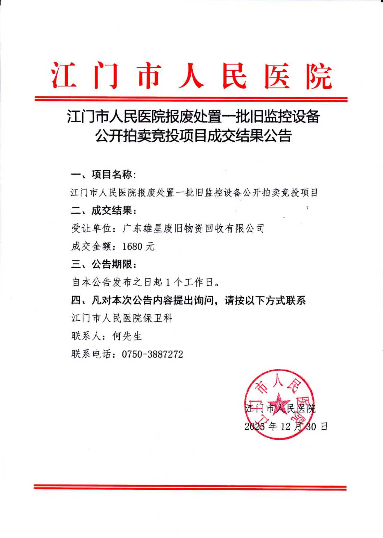 江门市人民医院报废处置一批旧监控设备公开拍卖竞投项目成交结果公告