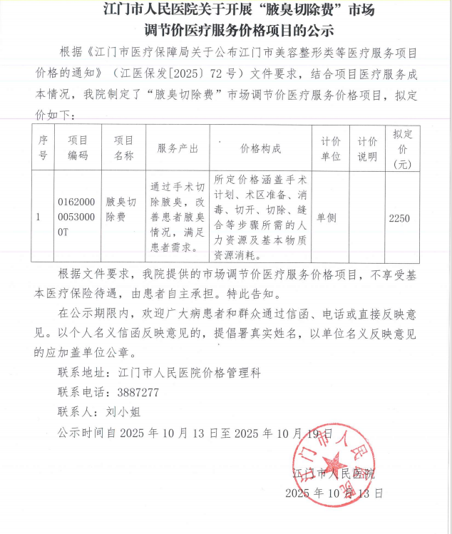 江门市人民医院关于开展“腋臭切除费”市场调节价医疗服务价格项目的公示