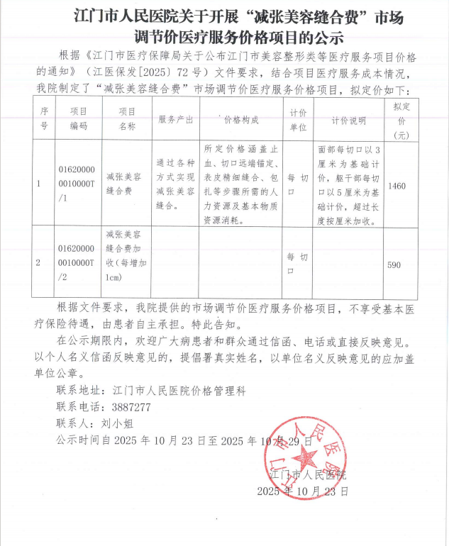 江门市人民医院关于开展“减张美容缝合费”市场 调节价医疗服务价格项目的公示