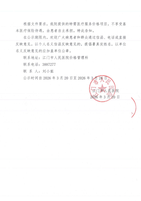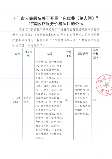 江门市人民医院关于开展“床位费(单人间)”特需医疗服务价格项目的公示