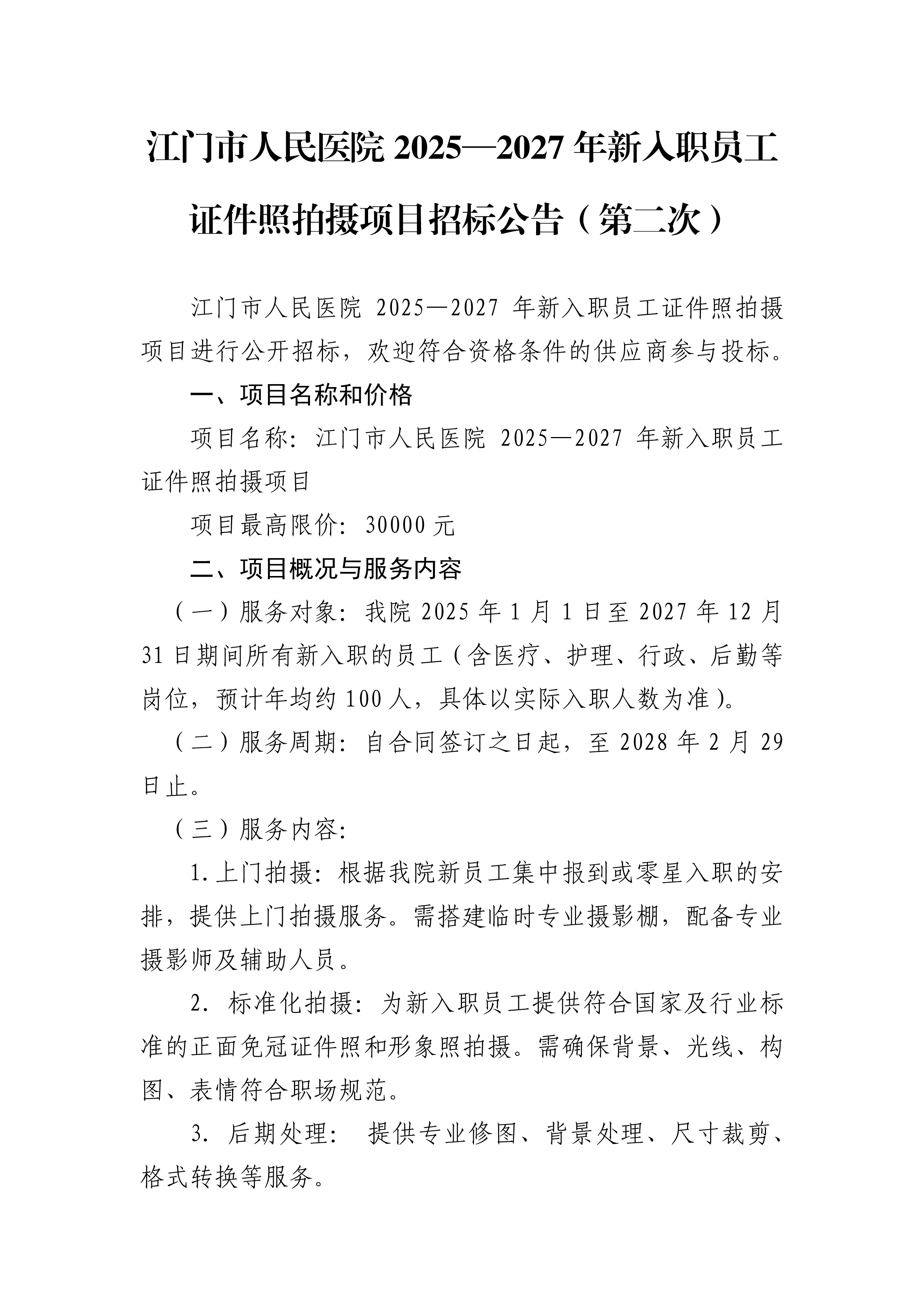 江门市人民医院2025一2027年新人职员工证件照拍摄项目招标公告(第二次)